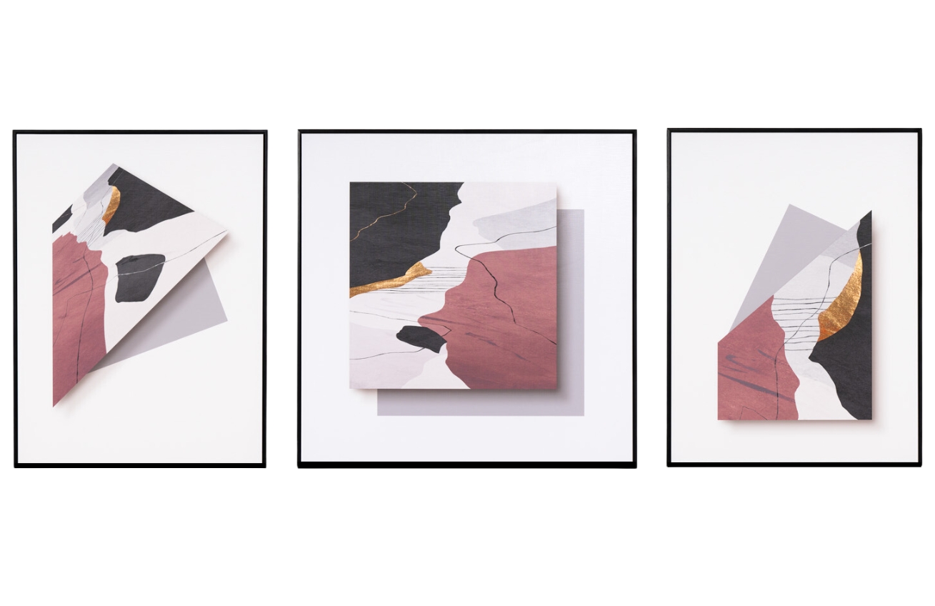 Set tří obrazů Ombra od španělské značky Somcasa doplní prázdné zdi o krásné moderní umění. Na obrazech můžete vidět hřejivé barvy, které spolu příjemně kontrastují a navzájem se doplňují. Hravou kompozici umocňuje tenký černý rám, vyrobený z lakovaného MDF. Vyladěný triptych tvoří perfektní kombinaci, která nejlépe zazáří v obývacím pokoji nad pohovkou či v ložnici nad postelí. Díky kovovým háčkům ho snadno a pohodlně pověsíte kamkoliv na zeď.